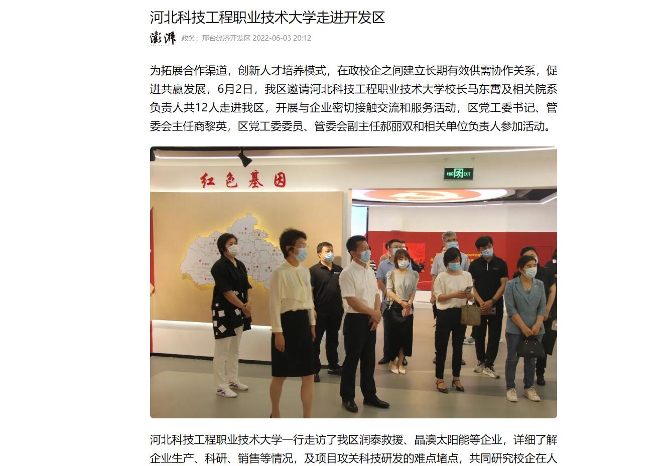 best365中国官方网站一行走访了我区润泰救援、晶澳太阳能等企业,详细了解企业生产、科研、销售等情况,及项目攻关科技研发的难点堵点,共同研究校企在人才供需、项目研发等方面合作的新路径,针对企业发展中存在的问题和如何推进校企共同发展,进行科技问诊服务,全力为企业纾困解难,当场与创力机电就工学一体化、在校生实习、实训等达成了初步合作意向。