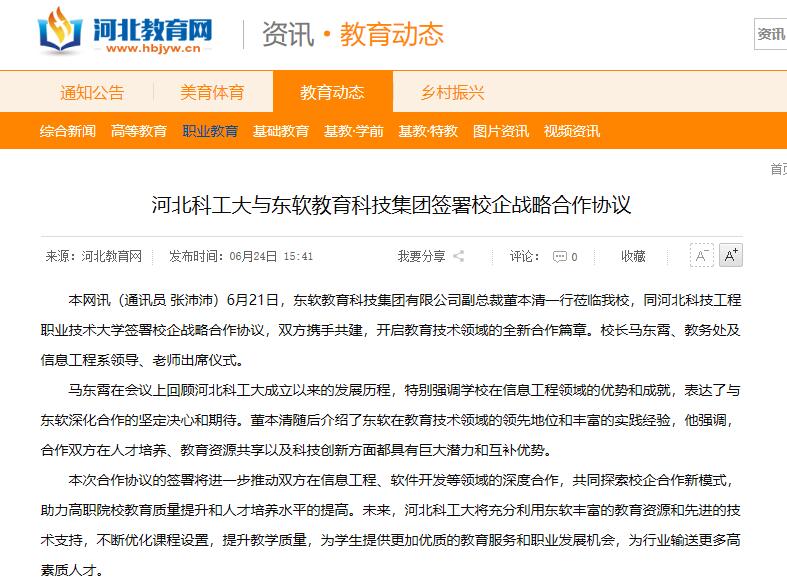 本次合作协议的签署将进一步推动双方在信息工程、软件开发等领域的深度合作,共同探索校企合作新模式,助力高职院校教育质量提升和人才培养水平的提高。未来,河北科工大将充分利用东软丰富的教育资源和先进的技术支持,不断优化课程设置,提升教学质量,为学生提供更加优质的教育服务和职业发展机会,为行业输送更多高素质人才。