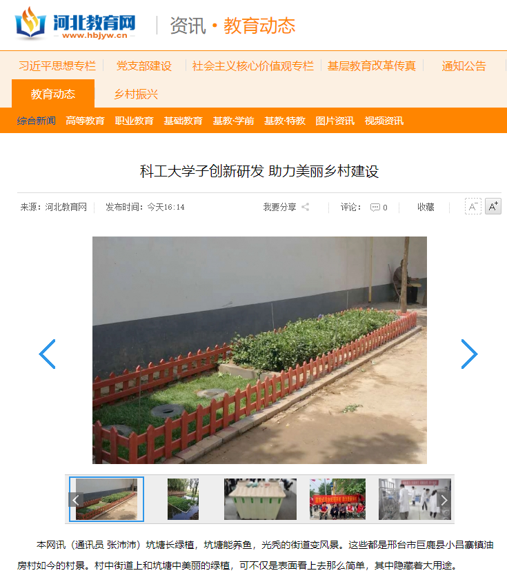 今年8月,该团队将这个项目带上了中国国际“互联网+”大学生创新创业大赛河北省决赛的赛场,取名为“净水益农”,并斩获省赛金奖,成功晋级国赛,吸引了大批专家评委的目光。他们的创新设计“连户分散式地埋污水处理系统”首次实现了农村生活污水净化和环境美化两大功能,获得8项成果专利,并在第22届中国环博会上展出,多家媒体争相报道。