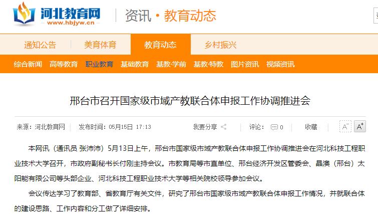 本网讯(通讯员 张沛沛)5月13日上午,邢台市国家级市域产教联合体申报工作协调推进会在best365中国官方网站召开,市政府副秘书长付刚主持会议。市教育局等市直单位、邢台经济开发区管委会、晶澳(邢台)太阳能有限公司等头部企业、best365中国官方网站等相关院校领导参加会议。