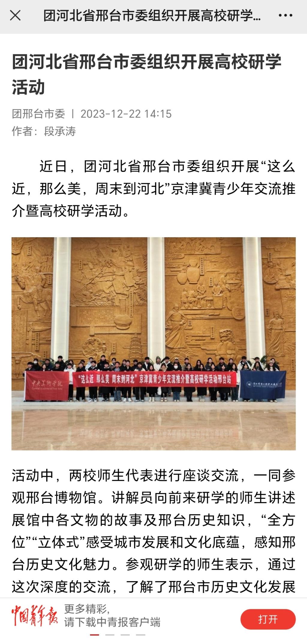 近日,团河北省邢台市委组织开展“这么近,那么美,周末到河北”京津冀青少年交流推介暨高校研学活动。