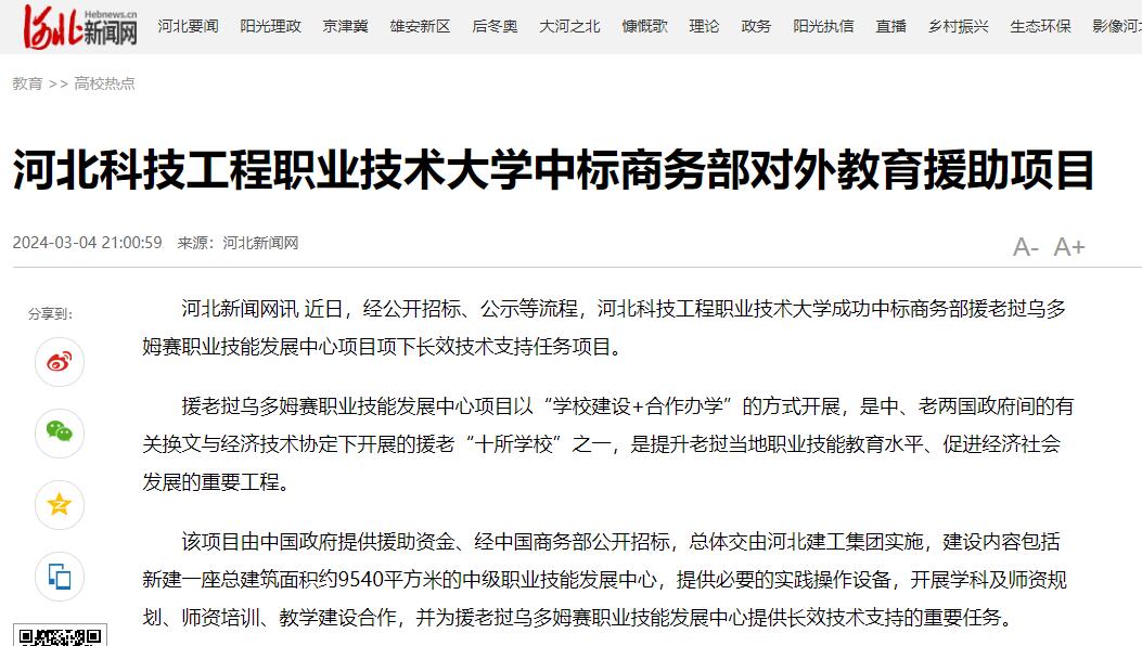 河北新闻网讯 近日,经公开招标、公示等流程,best365中国官方网站成功中标商务部援老挝乌多姆赛职业技能发展中心项目项下长效技术支持任务项目。