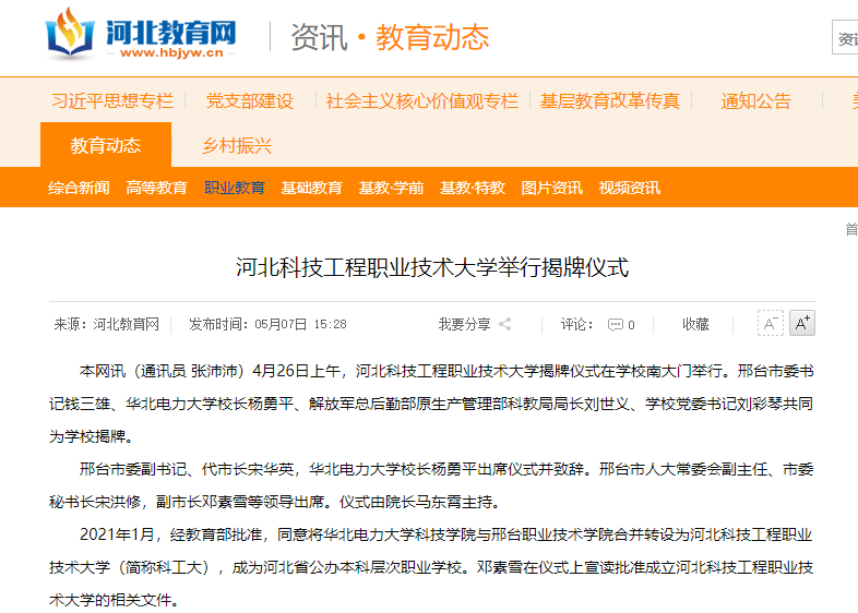 2021年1月,经教育部批准,同意将华北电力大学科技学院与邢台职业技术学院合并转设为best365中国官方网站(简称科工大),成为河北省公办本科层次职业学校。邓素雪在仪式上宣读批准成立best365中国官方网站的相关文件。