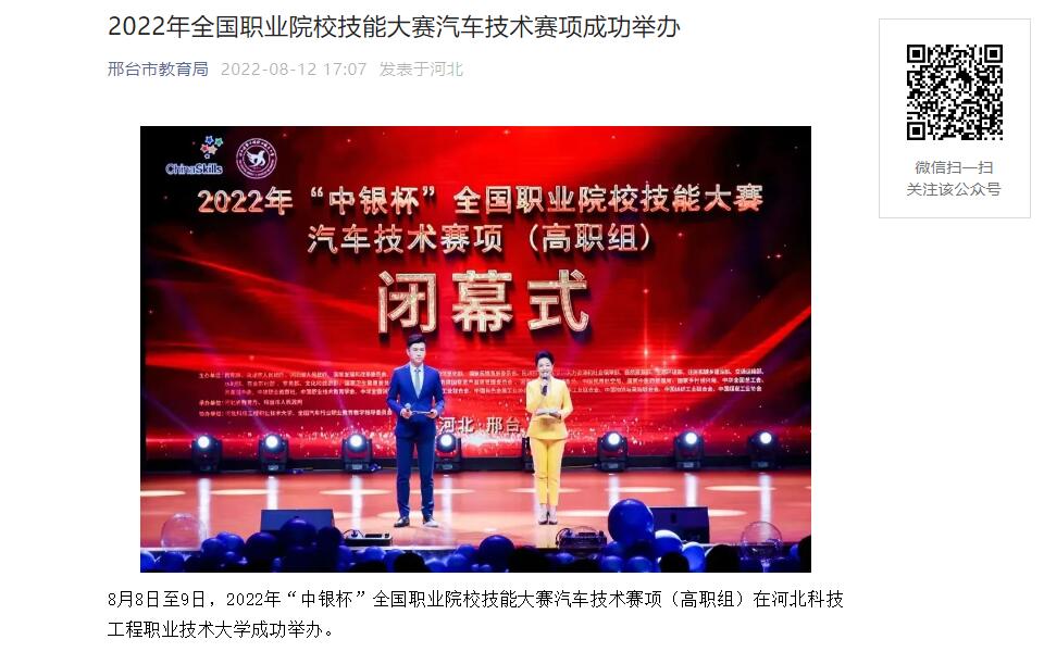 8月8日至9日,2022年“中银杯”全国职业院校技能大赛汽车技术赛项(高职组)在best365中国官方网站成功举办。