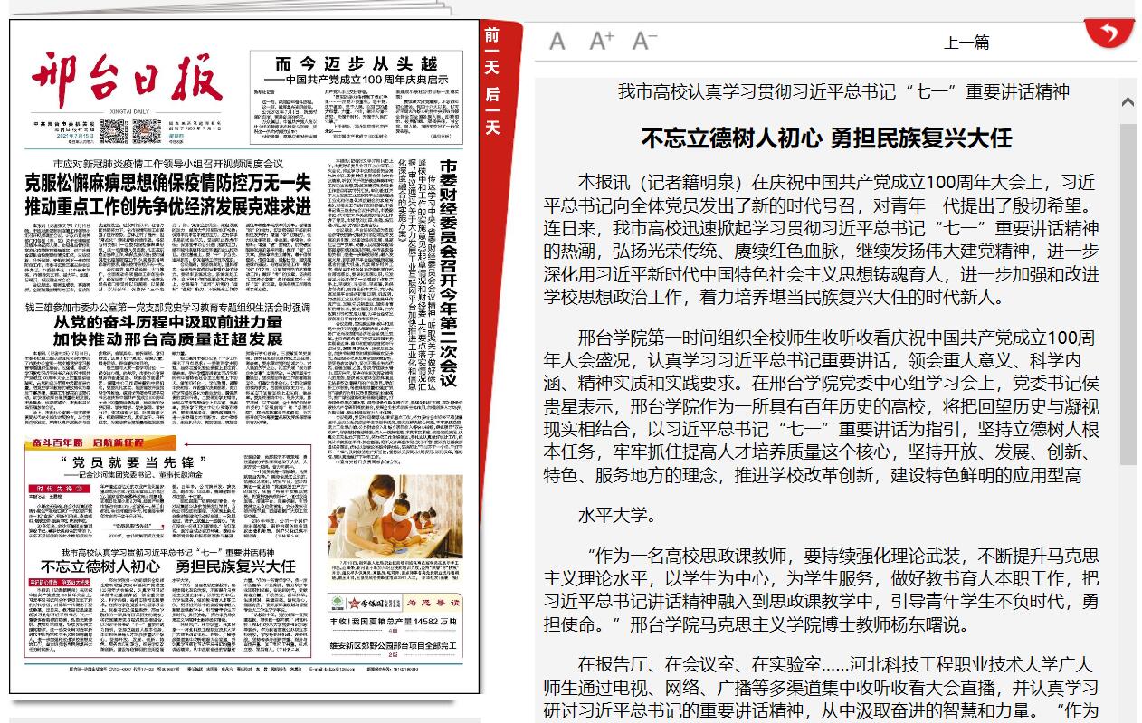 邢台学院第一时间组织全校师生收听收看庆祝中国共产党成立100周年大会盛况,认真学习习近平总书记重要讲话,领会重大意义、科学内涵、精神实质和实践要求。在邢台学院党委中心组学习会上,党委书记侯贵星表示,邢台学院作为一所具有百年历史的高校,将把回望历史与凝视现实相结合,以习近平总书记“七一”重要讲话为指引,坚持立德树人根本任务,牢牢抓住提高人才培养质量这个核心,坚持开放、发展、创新、特色、服务地方的理念,推进学校改革创新,建设特色鲜明的应用型高水平大学。