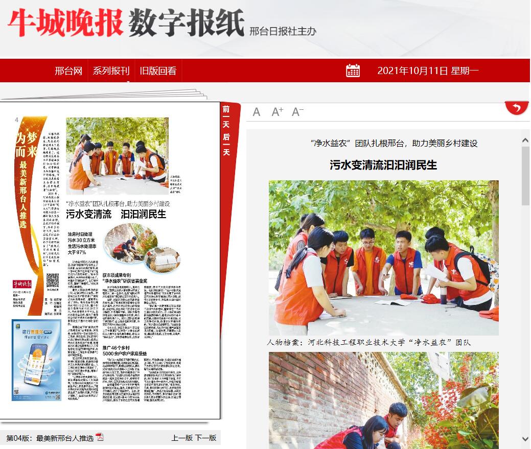 “该系统由太阳能进行供电,这种清洁能源供电的方式有效降低了碳排放,我们设备的上方种植了绿植,不仅可以处理生活中的污水,种植的绿植也有助于美化周边环境。”张齐星说,未来,我们打算扎根邢台,逐步向京津冀地区推广,并逐步走向全国,实现千村示范,万村整治,我们“净水益农”团队将扎根乡村振兴的战场,打造宜居环境,建设美丽乡村。