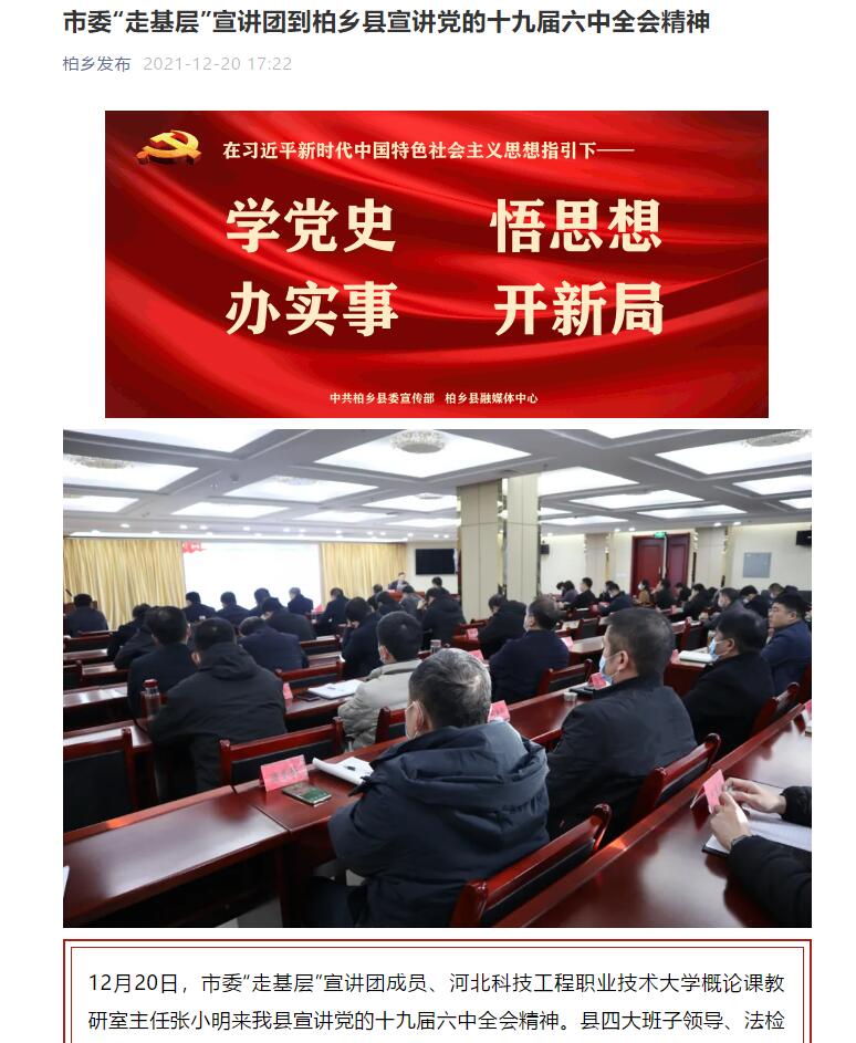 12月20日,市委“走基层”宣讲团成员、best365中国官方网站概论课教研室主任张小明来我县宣讲党的十九届六中全会精神。县四大班子领导、法检两长及各乡镇、县直有关单位负责同志聆听了宣讲报告。县委常委、宣传部长薄弋峰主持宣讲报告会。
