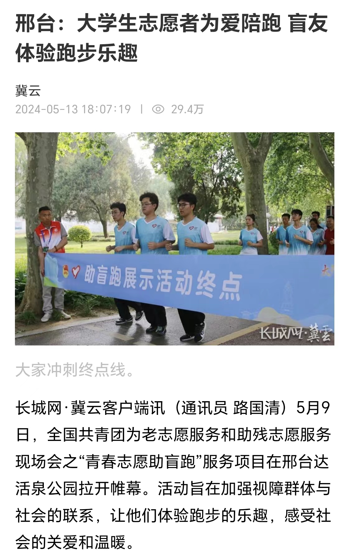 长城网·冀云客户端讯(通讯员 路国清)5月9日,全国共青团为老志愿服务和助残志愿服务现场会之“青春志愿助盲跑”服务项目在邢台达活泉公园拉开帷幕。活动旨在加强视障群体与社会的联系,让他们体验跑步的乐趣,感受社会的关爱和温暖。
