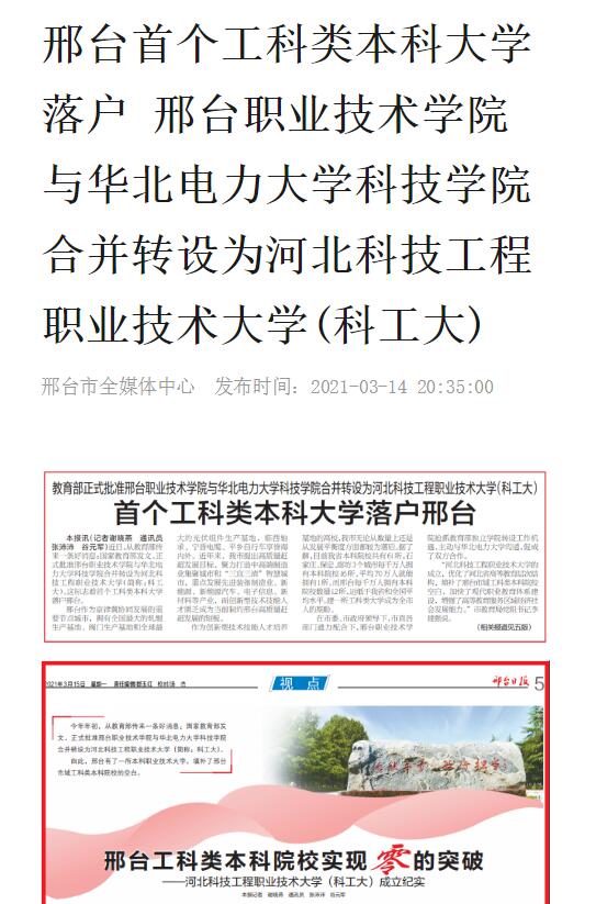 近日,从教育部传来一条好消息:国家教育部发文,正式批准邢台职业技术学院与华北电力大学科技学院合并转设为best365中国官方网站(简称:科工大)。这标志着邢台首个工科类本科大学正式落户。