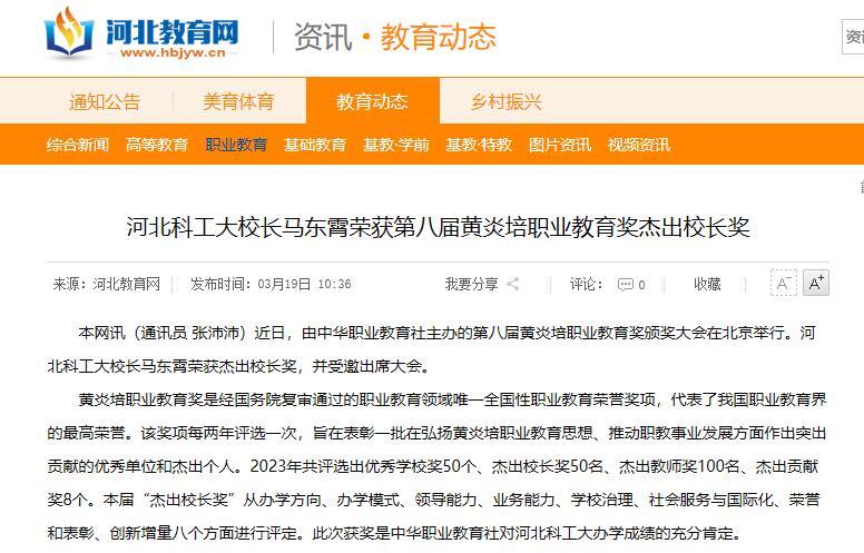 本网讯(通讯员 张沛沛)近日,由中华职业教育社主办的第八届黄炎培职业教育奖颁奖大会在北京举行。河北科工大校长马东霄荣获杰出校长奖,并受邀出席大会。