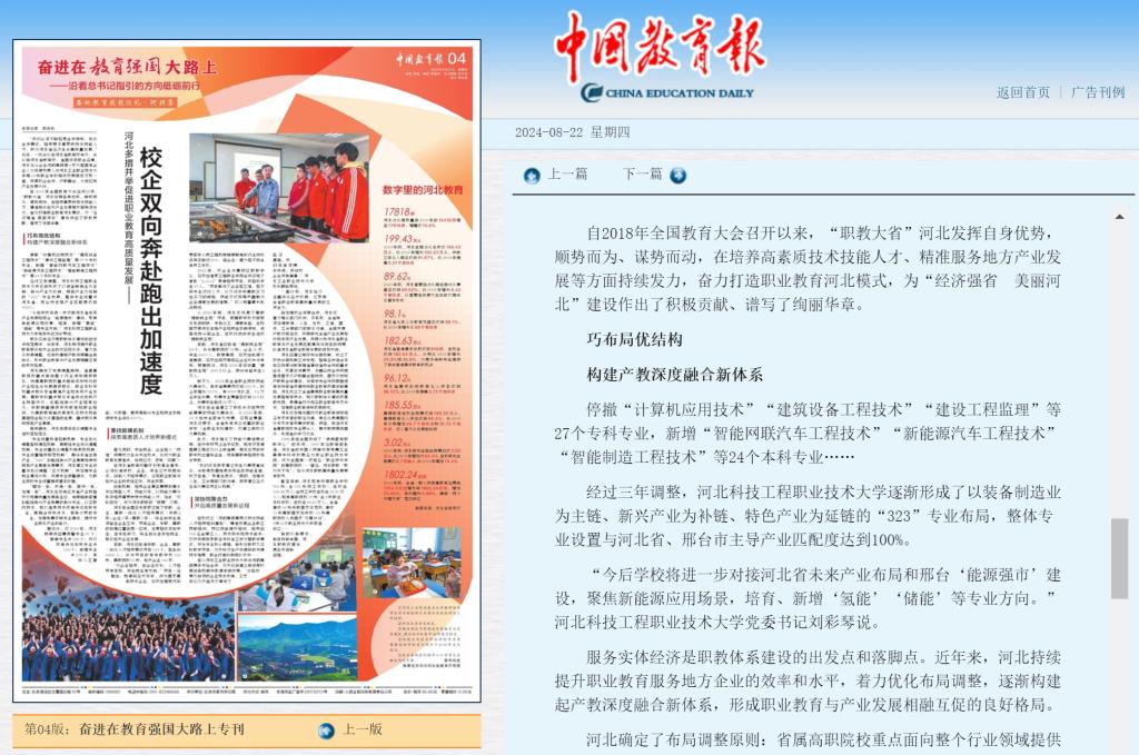 自2018年全国教育大会召开以来,“职教大省”河北发挥自身优势,顺势而为、谋势而动,在培养高素质技术技能人才、精准服务地方产业发展等方面持续发力,奋力打造职业教育河北模式,为“经济强省 美丽河北”建设作出了积极贡献、谱写了绚丽华章。