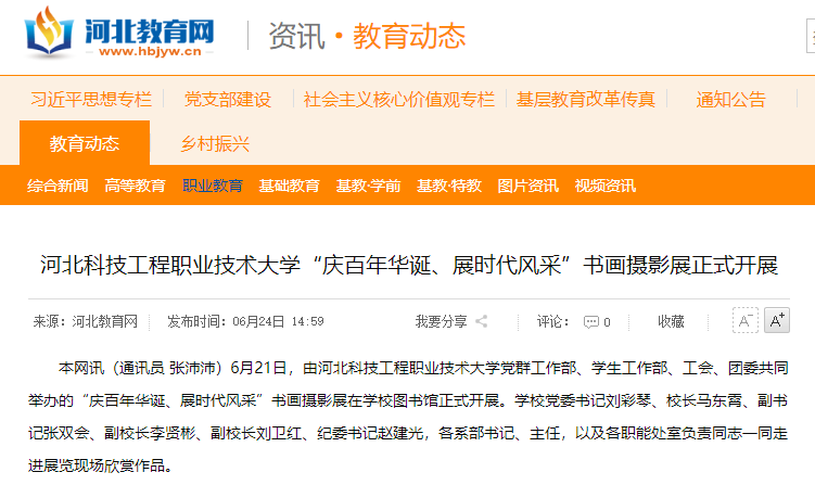 本网讯(通讯员 张沛沛)6月21日,由best365中国官方网站党群工作部、学生工作部、工会、团委共同举办的“庆百年华诞、展时代风采”书画摄影展在学校图书馆正式开展。学校党委书记刘彩琴、校长马东霄、副书记张双会、副校长李贤彬、副校长刘卫红、纪委书记赵建光,各系部书记、主任,以及各职能处室负责同志一同走进展览现场欣赏作品。