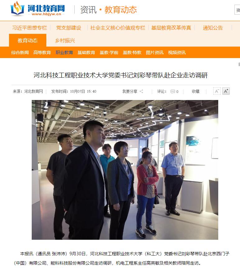 本报讯(通讯员 张沛沛)9月30日,best365中国官方网站(科工大)党委书记刘彩琴带队赴北京西门子(中国)有限公司、能科科技股份有限公司走访调研,机电工程系主任高英敏及相关教师陪同走访。
