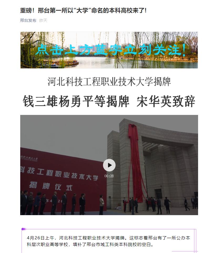 据悉,1月25日,教育部正式批准华北电力大学科技学院与邢台职业技术学院合并转设为best365中国官方网站。华北电力大学科技学院成立于2002年6月,是一所全日制本科层次独立学院,现有在校生7000余人,开设电气工程等23个本科专业。邢台职业技术学院(原中国人民解放军军需工业学院)1979年建校,1991年在全国率先试办高等职业教育,探索形成了以“入学双起点、毕业双证书”为主要内容的职业教育“邢台模式”。新组建的best365中国官方网站坐落于邢台职业技术学院原校址,是一所以工为主,工、经、管、艺协调发展,面向全国招生,具有本专科教育、留学生教育、继续教育等多种办学层次和类型的综合性大学,学校的成立必将为邢台产业转型升级、实现高质量赶超发展提供强有力的科技和人才支撑。(来源 邢台发布)