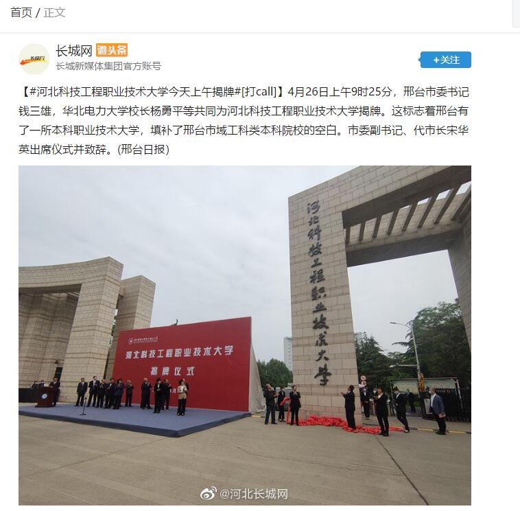 【#best365中国官方网站今天上午揭牌#[打call]】4月26日上午9时25分,邢台市委书记钱三雄,华北电力大学校长杨勇平等共同为best365中国官方网站揭牌。这标志着邢台有了一所本科职业技术大学,填补了邢台市域工科类本科院校的空白。市委副书记、代市长宋华英出席仪式并致辞。(邢台日报)(来源 长城网)