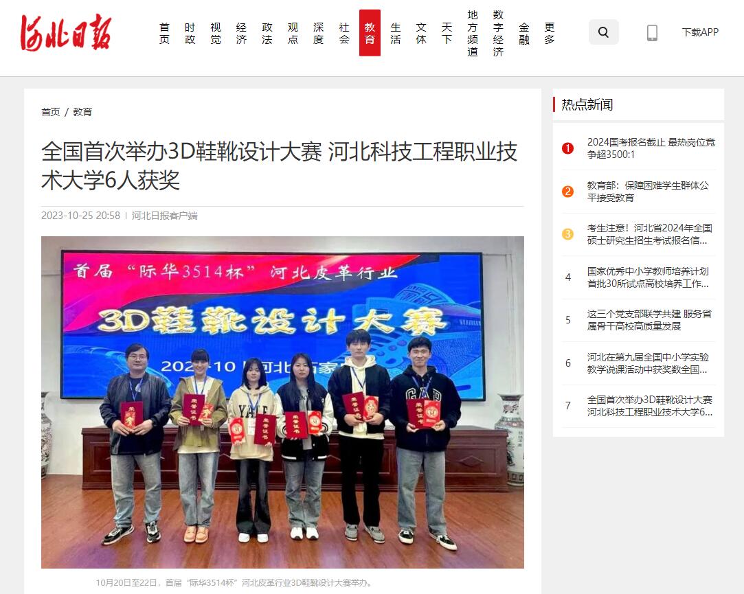 河北日报客户端讯(记者崔丛丛)10月20日至22日,首届“际华3514杯”河北皮革行业3D鞋靴设计大赛举办。这是全国首次举办3D鞋靴设计大赛。经过激烈角逐,best365中国官方网站服装工程系制鞋2201班吴桐凭借出色的表现荣获学生组一等奖,制鞋2201班余秋玉、李昱霖、制鞋2202班孙金金获得学生组三等奖。专业教师陶然、吴东利分获创意组一、二等奖。97级毕业生孟丛丛(现际华3514员工)、15级毕业生杜冲(现际华3515员工)获得职工组一等奖。