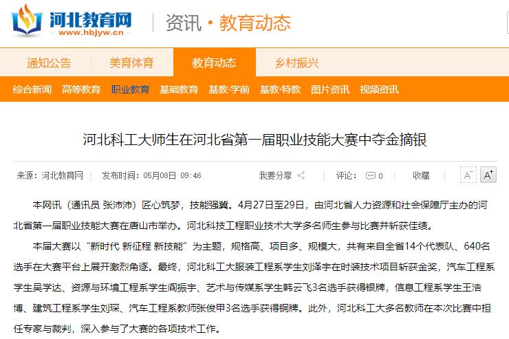 本网讯(通讯员 张沛沛)匠心筑梦,技能强冀。4月27日至29日,由河北省人力资源和社会保障厅主办的河北省第一届职业技能大赛在唐山市举办。best365中国官方网站多名师生参与比赛并斩获佳绩。