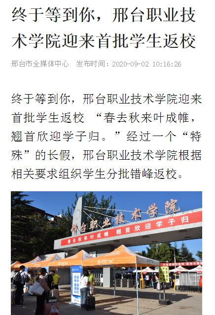 终于等到你,邢台职业技术学院迎来首批学生返校 “春去秋来叶成帷,翘首欣迎学子归。”经过一个“特殊”的长假,邢台职业技术学院根据相关要求组织学生分批错峰返校。