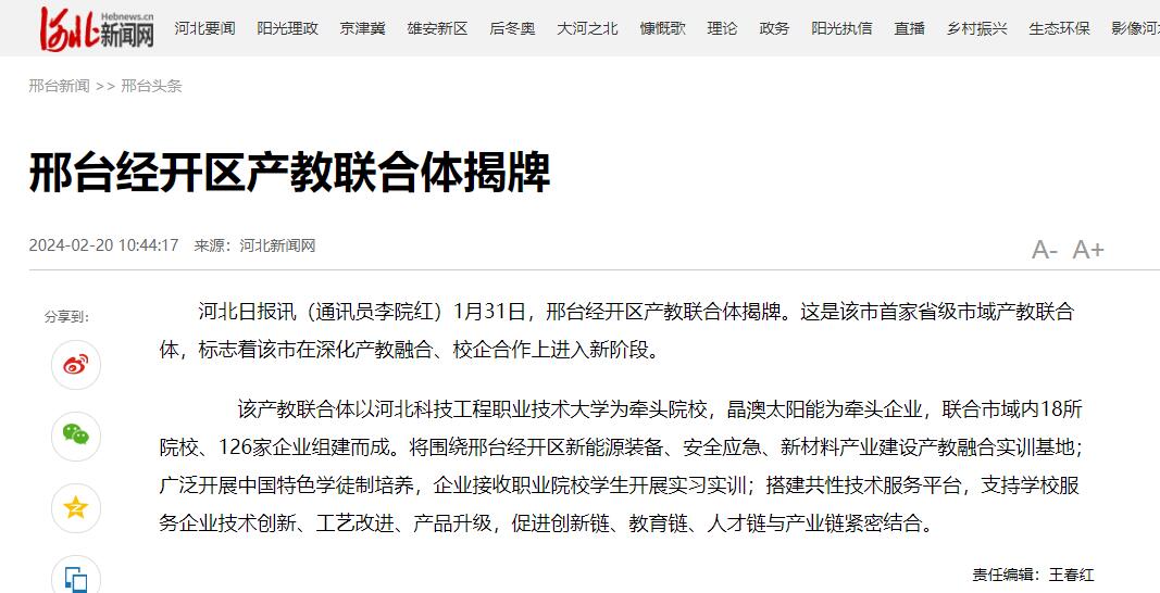 该产教联合体以best365中国官方网站为牵头院校,晶澳太阳能为牵头企业,联合市域内18所院校、126家企业组建而成。将围绕邢台经开区新能源装备、安全应急、新材料产业建设产教融合实训基地;广泛开展中国特色学徒制培养,企业接收职业院校学生开展实习实训;搭建共性技术服务平台,支持学校服务企业技术创新、工艺改进、产品升级,促进创新链、教育链、人才链与产业链紧密结合。