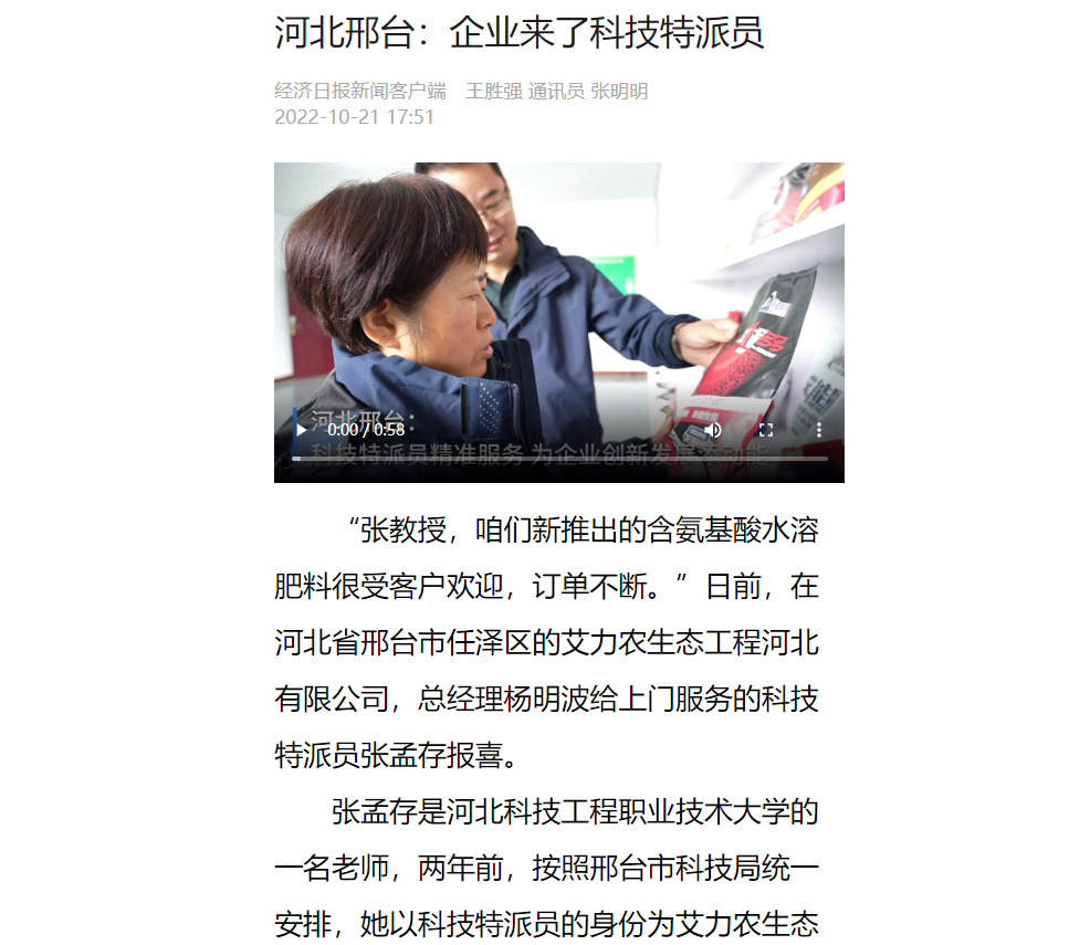 “张教授,咱们新推出的含氨基酸水溶肥料很受客户欢迎,订单不断。”日前,在河北省邢台市任泽区的艾力农生态工程河北有限公司,总经理杨明波给上门服务的科技特派员张孟存报喜。