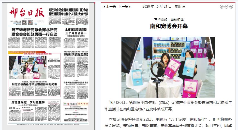 本网讯(通讯员 张沛沛)10月20日,第四届中国·南和(国际)宠物产业博览会暨首届南和宠物嘉年华直播节在南和区宠物产业奥特莱斯开幕。邢台职业技术学院艺术与传媒系教师张晓纪带领学生为企业个性化品牌形象设计的宠物粮包装亮相展览会,获得客户好评。