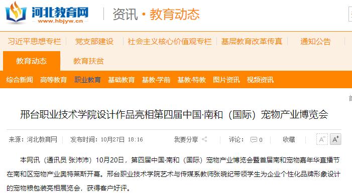 艺术与传媒系始终注重“产、学、研、用”协同创新人才培养,充分发挥专业学科优势,坚持以培养高素质、高技能人才和服务区域经济建设与社会发展为使命,在校企合作、人才培养等方面进行探索,采取多种形式深化校企合作的力度和广度,促进产学研用深度融合,增强服务地方经济升级,助力“中国宠物产业之都”品牌企业打造。《邢台日报》头版新闻《南和宠博会开幕》配图刊登学院设计的包装作品。会后,先后有多家企业同学院有合作意向。