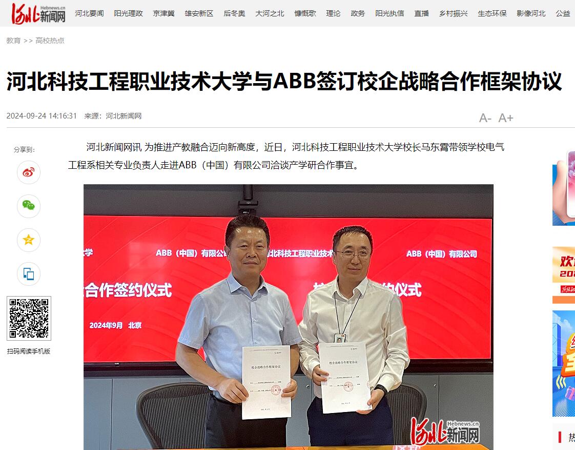 河北新闻网讯 为推进产教融合迈向新高度,近日,best365中国官方网站校长马东霄带领学校电气工程系相关专业负责人走进ABB(中国)有限公司洽谈产学研合作事宜。