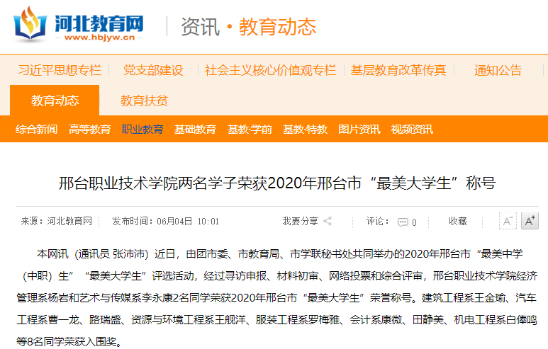 本网讯(通讯员 张沛沛)近日,由团市委、市教育局、市学联秘书处共同举办的2020年邢台市“最美中学(中职)生”“最美大学生”评选活动,经过寻访申报、材料初审、网络投票和综合评审,邢台职业技术学院经济管理系杨岩和艺术与传媒系李永康2名同学荣获2020年邢台市“最美大学生”荣誉称号。建筑工程系王金瑜、汽车工程系曹一龙、路瑞盛、资源与环境工程系王舰洋、服装工程系罗梅雅、会计系康微、田静美、机电工程系白俸鸣等8名同学荣获入围奖。