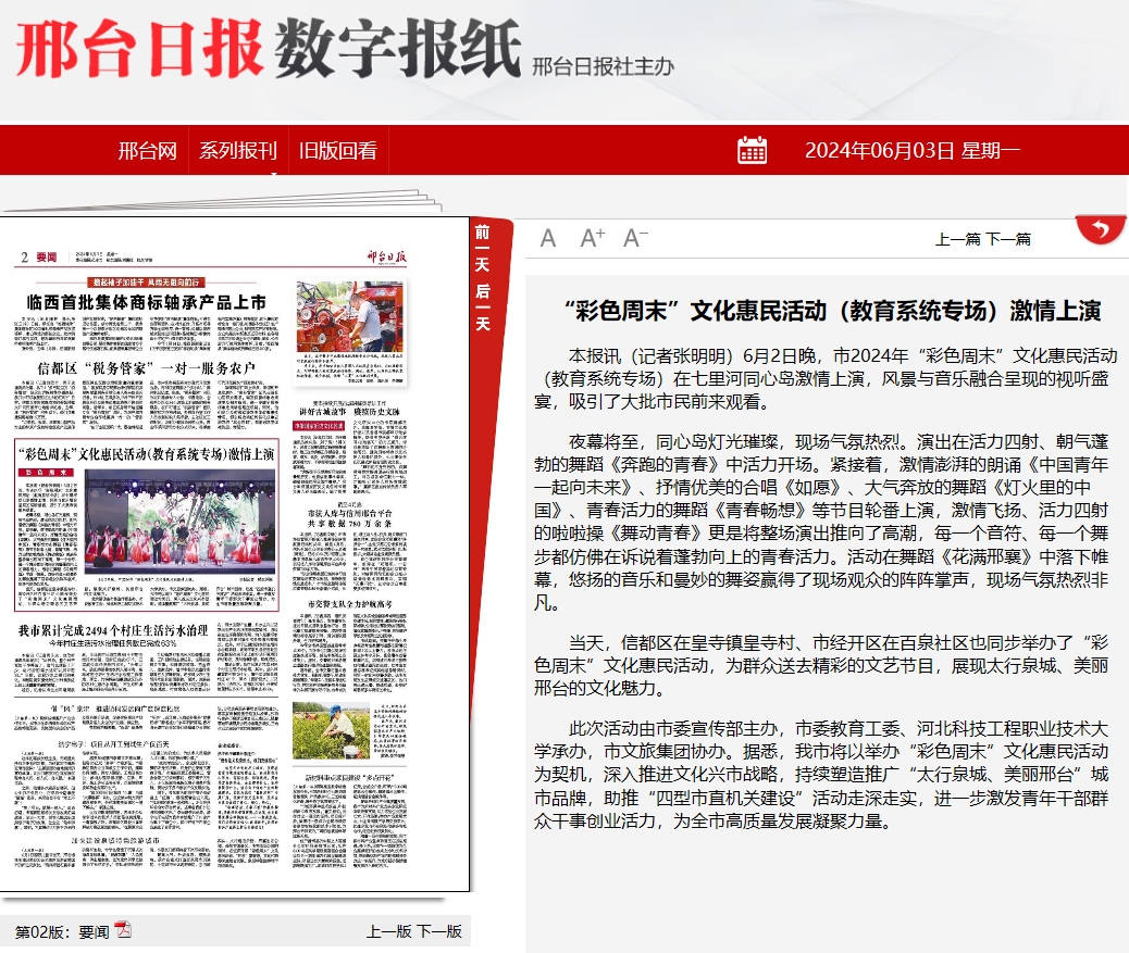 当天,信都区在皇寺镇皇寺村、市经开区在百泉社区也同步举办了“彩色周末”文化惠民活动,为群众送去精彩的文艺节目,展现太行泉城、美丽邢台的文化魅力。