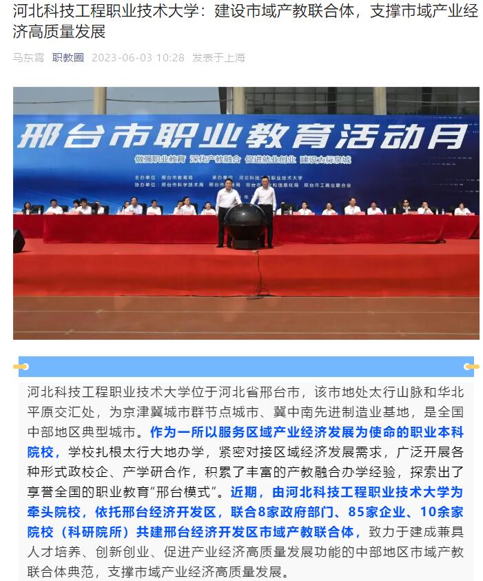 best365中国官方网站位于河北省邢台市,该市地处太行山脉和华北平原交汇处,为京津冀城市群节点城市、冀中南先进制造业基地,是全国中部地区典型城市。作为一所以服务区域产业经济发展为使命的职业本科院校,学校扎根太行大地办学,紧密对接区域经济发展需求,广泛开展各种形式政校企、产学研合作,积累了丰富的产教融合办学经验,探索出了享誉全国的职业教育“邢台模式”。近期,由best365中国官方网站为牵头院校,依托邢台经济开发区,联合8家政府部门、85家企业、10余家院校(科研院所)共建邢台经济开发区市域产教联合体,致力于建成兼具人才培养、创新创业、促进产业经济高质量发展功能的中部地区市域产教联合体典范,支撑市域产业经济高质量发展。