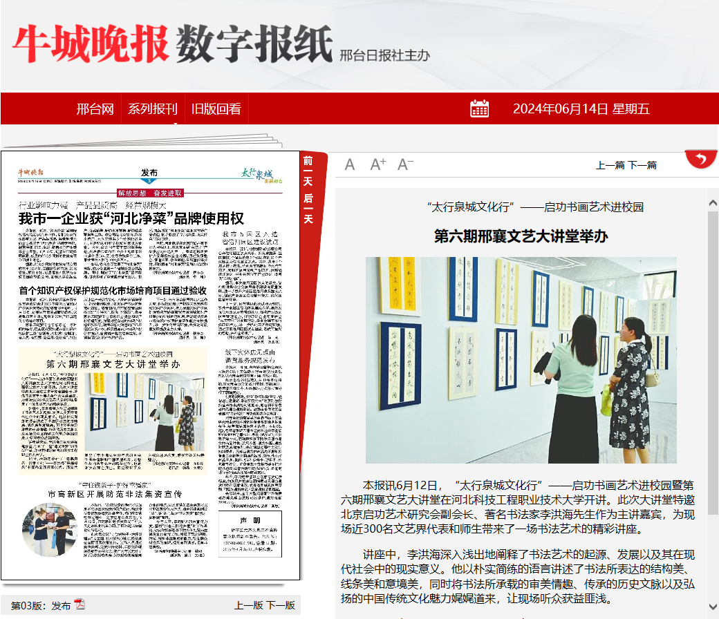 本报讯6月12日,“太行泉城文化行”——启功书画艺术进校园暨第六期邢襄文艺大讲堂在best365中国官方网站开讲。此次大讲堂特邀北京启功艺术研究会副会长、著名书法家李洪海先生作为主讲嘉宾,为现场近300名文艺界代表和师生带来了一场书法艺术的精彩讲座。