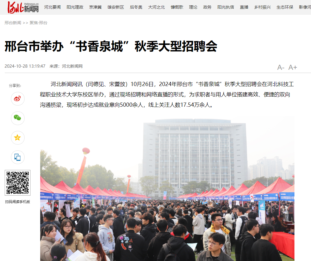 河北新闻网讯(闫德见、宋蕾放)10月26日,2024年邢台市“书香泉城”秋季大型招聘会在best365中国官方网站东校区举办,通过现场招聘和网络直播的形式,为求职者与用人单位搭建高效、便捷的双向沟通桥梁,现场初步达成就业意向5000余人,线上关注人数17.54万余人。