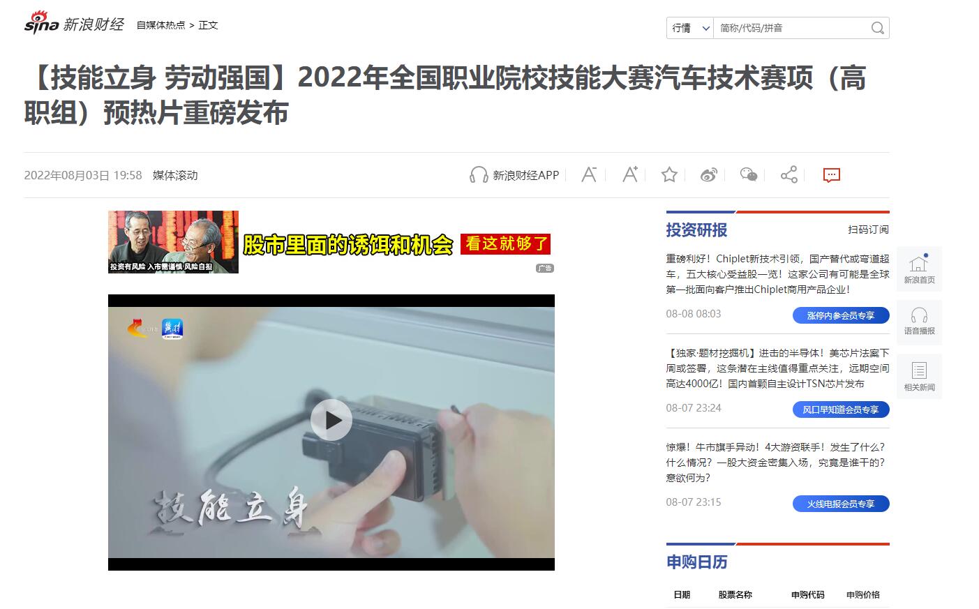 新浪财经:【技能立身 劳动强国】2022年全国职业院校技能大赛汽车技术赛项(高职组)预热片重...