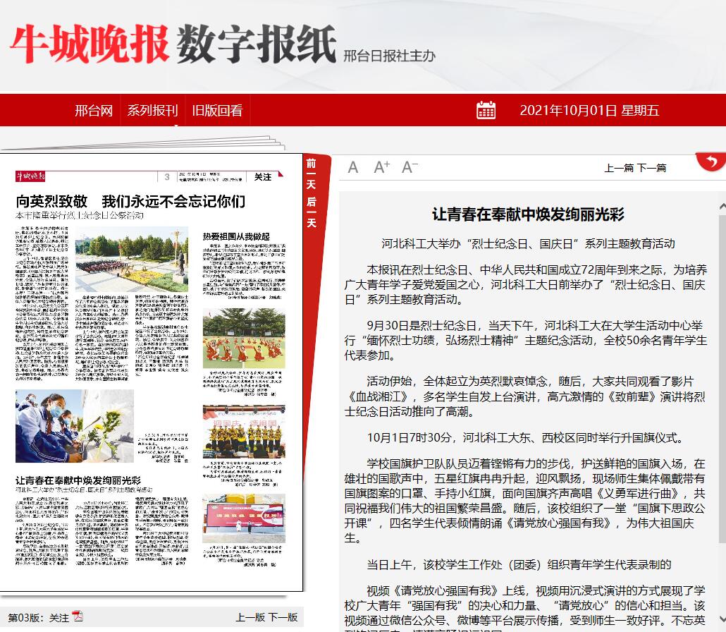 本报讯在烈士纪念日、中华人民共和国成立72周年到来之际,为培养广大青年学子爱党爱国之心,河北科工大日前举办了“烈士纪念日、国庆日”系列主题教育活动。