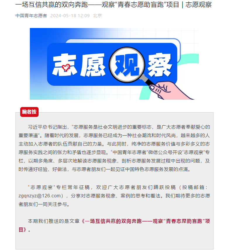 笔者认为,“青春志愿助盲跑”项目逐渐受到志愿服务组织关注推广的原因主要有三个方面。