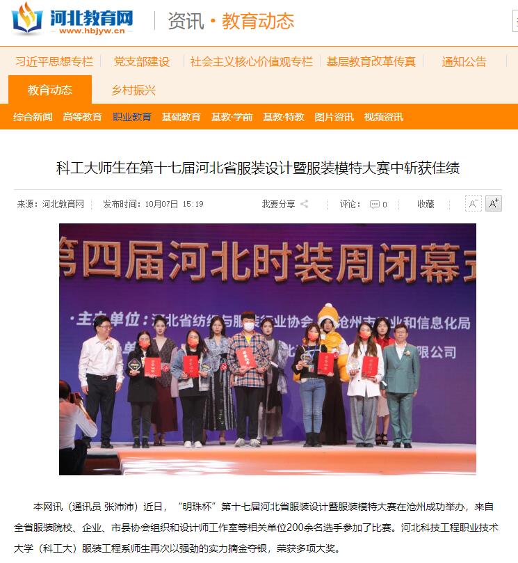 本网讯(通讯员 张沛沛)近日,“明珠杯”第十七届河北省服装设计暨服装模特大赛在沧州成功举办,来自全省服装院校、企业、市县协会组织和设计师工作室等相关单位200余名选手参加了比赛。best365中国官方网站(科工大)服装工程系师生再次以强劲的实力摘金夺银,荣获多项大奖。