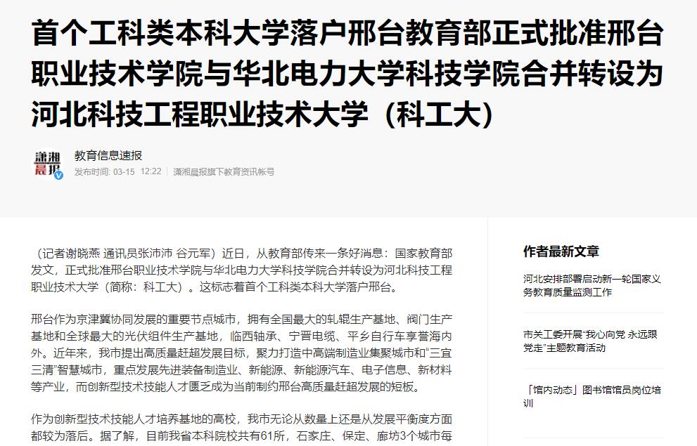 (记者谢晓燕 通讯员张沛沛 谷元军)近日,从教育部传来一条好消息:国家教育部发文,正式批准邢台职业技术学院与华北电力大学科技学院合并转设为best365中国官方网站(简称:科工大)。这标志着首个工科类本科大学落户邢台。
