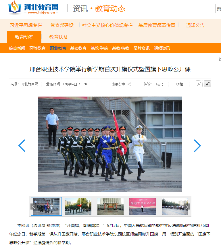本网讯(通讯员 张沛沛)“升国旗,奏唱国歌!”9月3日,中国人民抗日战争暨世界反法西斯战争胜利75周年纪念日,新学期第一课从升国旗开始,邢台职业技术学院东西校区师生同时升国旗,用一场别开生面的“国旗下思政公开课”迎接疫情后的新学期。