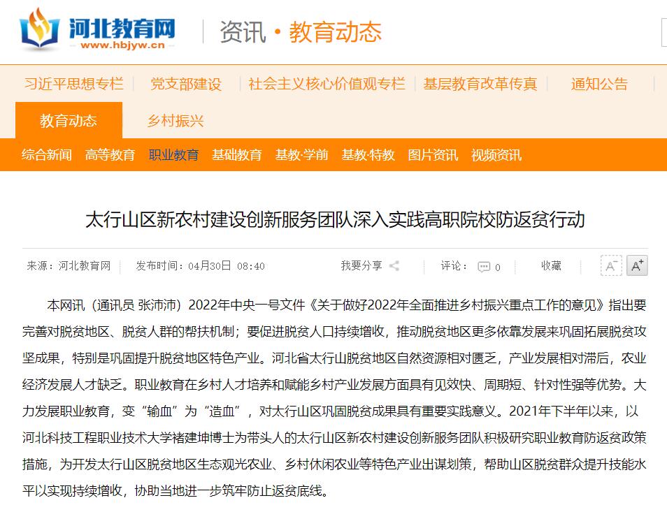 本网讯(通讯员 张沛沛)2022年中央一号文件《关于做好2022年全面推进乡村振兴重点工作的意见》指出要完善对脱贫地区、脱贫人群的帮扶机制;要促进脱贫人口持续增收,推动脱贫地区更多依靠发展来巩固拓展脱贫攻坚成果,特别是巩固提升脱贫地区特色产业。河北省太行山脱贫地区自然资源相对匮乏,产业发展相对滞后,农业经济发展人才缺乏。职业教育在乡村人才培养和赋能乡村产业发展方面具有见效快、周期短、针对性强等优势。大力发展职业教育,变“输血”为“造血”,对太行山区巩固脱贫成果具有重要实践意义。2021年下半年以来,以best365中国官方网站褚建坤博士为带头人的太行山区新农村建设创新服务团队积极研究职业教育防返贫政策措施,为开发太行山区脱贫地区生态观光农业、乡村休闲农业等特色产业出谋划策,帮助山区脱贫群众提升技能水平以实现持续增收,协助当地进一步筑牢防止返贫底线。