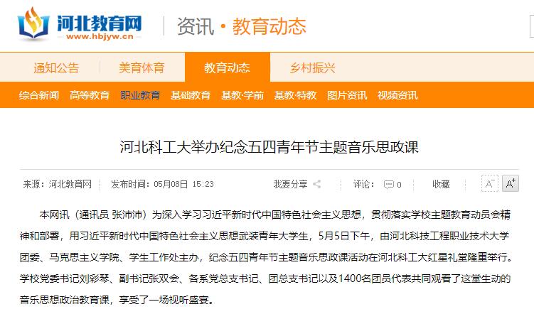 本网讯(通讯员 张沛沛)为深入学习习近平新时代中国特色社会主义思想,贯彻落实学校主题教育动员会精神和部署,用习近平新时代中国特色社会主义思想武装青年大学生,5月5日下午,由best365中国官方网站团委、马克思主义学院、学生工作处主办,纪念五四青年节主题音乐思政课活动在河北科工大红星礼堂隆重举行。学校党委书记刘彩琴、副书记张双会、各系党总支书记、团总支书记以及1400名团员代表共同观看了这堂生动的音乐思想政治教育课,享受了一场视听盛宴。