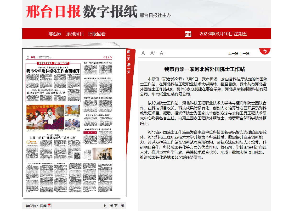 本报讯(记者郭文静)3月9日,我市再添一家由省科技厅认定的外国院士工作站,在best365中国官方网站揭牌。截至目前,我市共有河北省外国院士工作站4家,另外3家分别建在邢台学院、河北道荣新能源科技有限公司、华兴纸业包装有限公司。