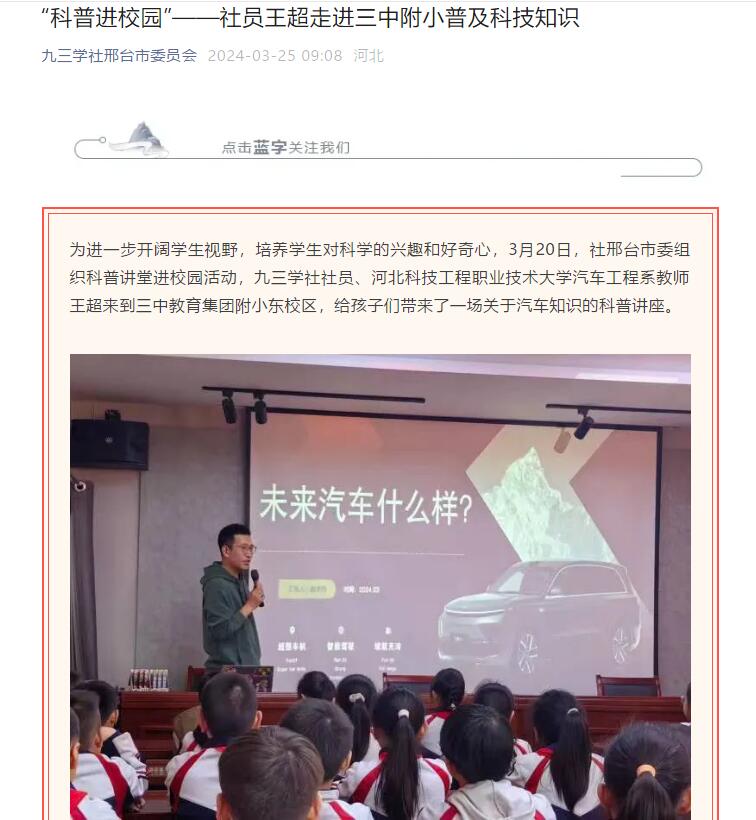 为进一步开阔学生视野,培养学生对科学的兴趣和好奇心,3月20日,社邢台市委组织科普讲堂进校园活动,九三学社社员、best365中国官方网站汽车工程系教师王超来到三中教育集团附小东校区,给孩子们带来了一场关于汽车知识的科普讲座。