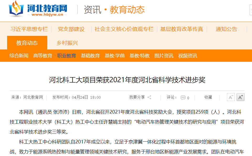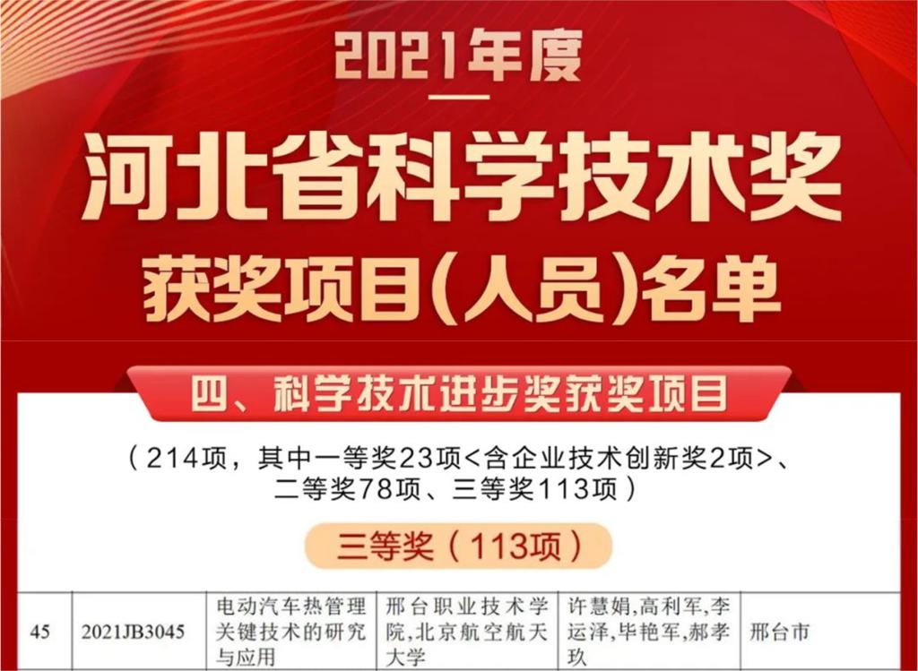 本网讯(通讯员 张沛沛)日前,河北省召开2021年度河北省科技奖励大会,授奖项目259项(人)。best365中国官方网站(科工大)热工中心主任许慧娟主持的“电动汽车热管理关键技术的研究与应用”项目荣获河北省科学技术进步奖三等奖。