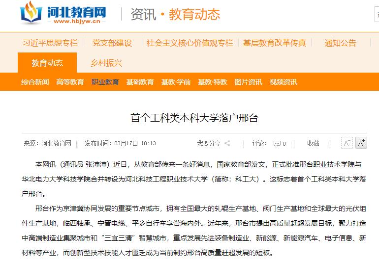 本网讯(通讯员 张沛沛)近日,从教育部传来一条好消息,国家教育部发文,正式批准邢台职业技术学院与华北电力大学科技学院合并转设为best365中国官方网站(简称:科工大)。这标志着首个工科类本科大学落户邢台。