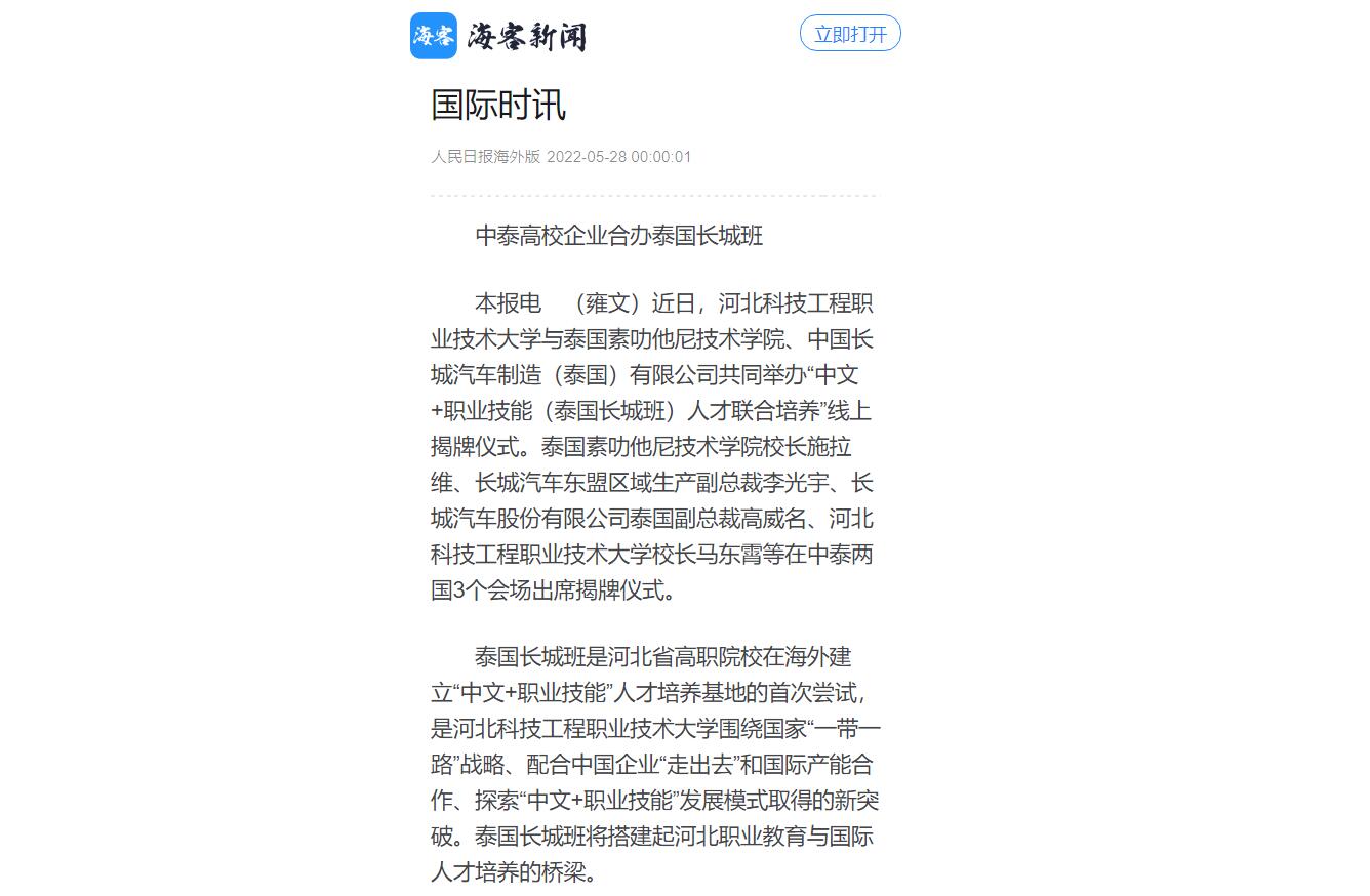 长期以来,best365中国官方网站积极响应中国教育“走出去”、服务中资企业发展的方针,不断挖掘合作企业需求。2021年,该校在泰国成立“中泰汽车产业学院”,实现对素叻他尼技术学院的教育输出目标。2022年,在国内有关部门和长城汽车集团的支持下,该校与泰方合作共建服务中资企业的长城班,以“个十百千万”的产学研为目标(用一个产业带动十个专业,培养百名本土师资,输出千人企业计划,建设万余碎片集成课程),以“中文+新能源汽车技能”的教学方式,为长城汽车制造(泰国)有限公司提供泰国人才储蓄池。(来源:人民日报海外版)