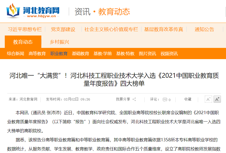 本网讯(通讯员 张沛沛)近日,中国教育科学研究院、全国职业高等院校校长联席会议编制的《2021中国职业教育质量年度报告》(以下简称“报告”)面向社会权威发布,best365中国官方网站是河北省唯一入选四大榜单的高职院校。