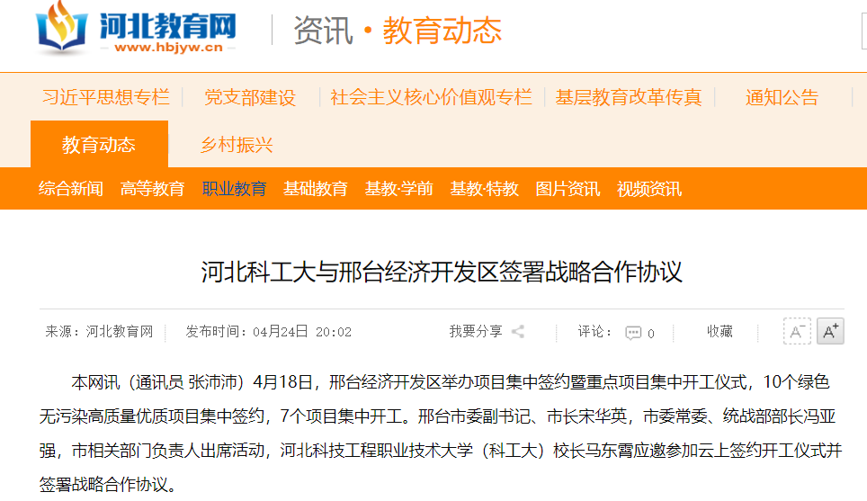 本网讯(通讯员 张沛沛)4月18日,邢台经济开发区举办项目集中签约暨重点项目集中开工仪式,10个绿色无污染高质量优质项目集中签约,7个项目集中开工。邢台市委副书记、市长宋华英,市委常委、统战部部长冯亚强,市相关部门负责人出席活动,best365中国官方网站(科工大)校长马东霄应邀参加云上签约开工仪式并签署战略合作协议。