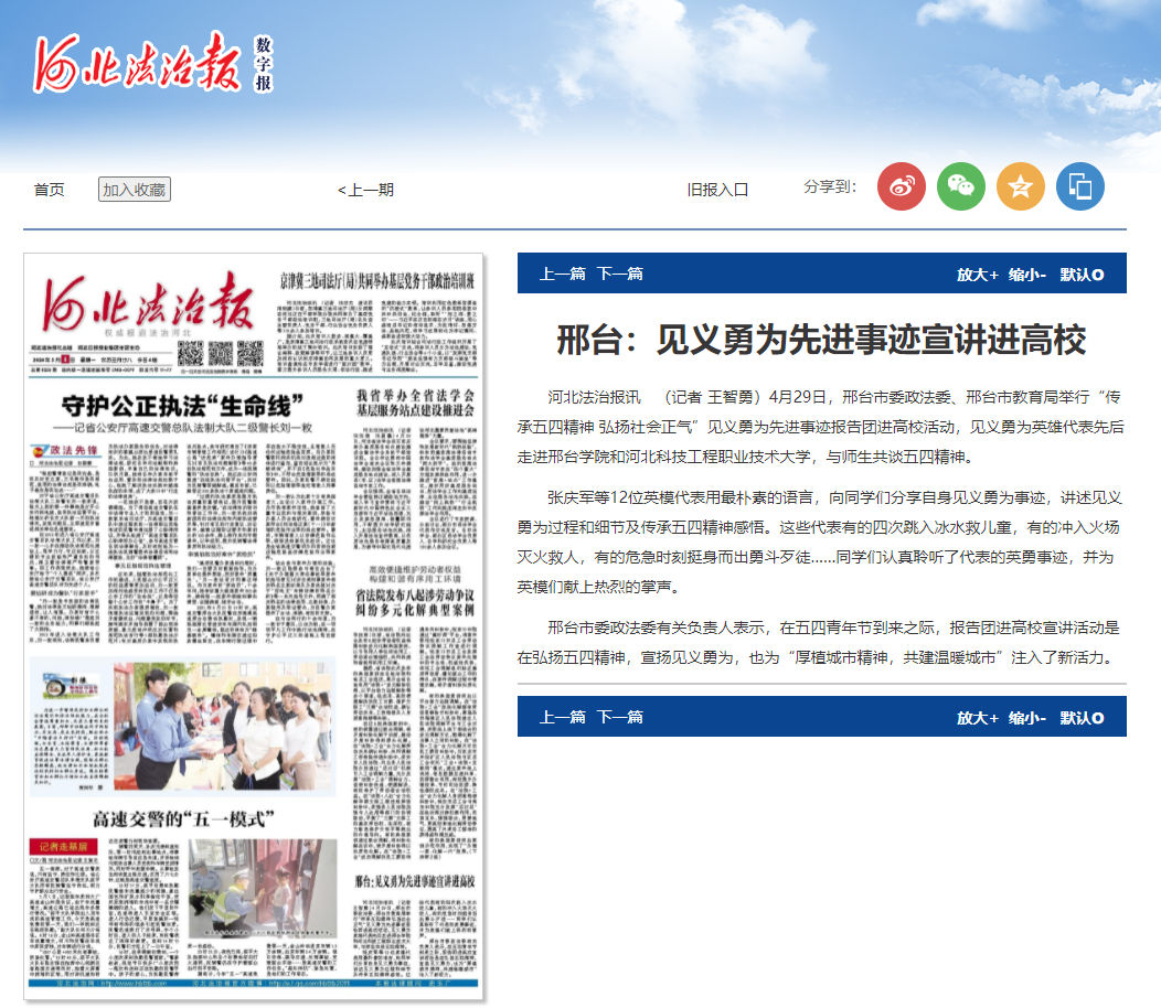 河北法治报讯 (记者 王智勇)4月29日,邢台市委政法委、邢台市教育局举行“传承五四精神 弘扬社会正气”见义勇为先进事迹报告团进高校活动,见义勇为英雄代表先后走进邢台学院和best365中国官方网站,与师生共谈五四精神。