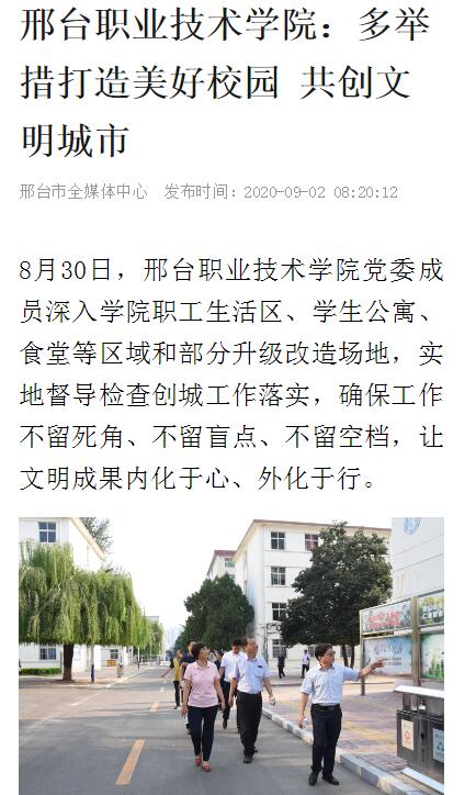 在学生秋季开学之际,邢台职业技术学院还将建立健全长效机制,持续教育引导广大师生积极配合和参与创建全国文明城市,提高师生知晓率、参与率和满意度。在全院范围形成“人人参与、人人奉献、人人受益”的良好创建氛围,全院师生员工定会凝聚起强大合力,以实际行动和良好业绩为邢台市创建全国文明城市贡献力量。(邢台日报社全媒体记者刘晓英 通讯员张沛沛)(来源 邢台市全媒体中心)