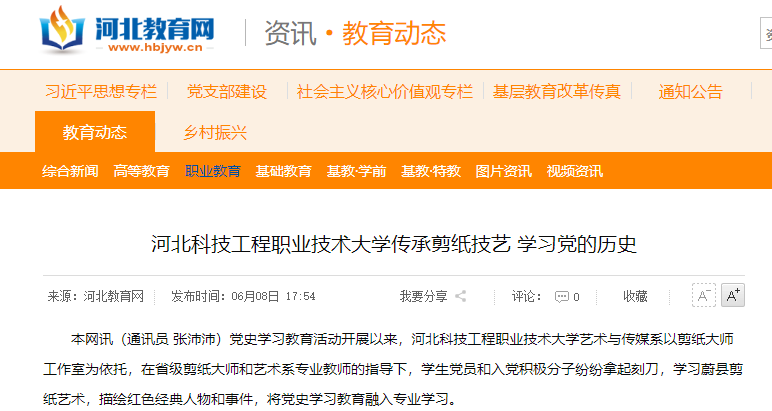 本网讯(通讯员 张沛沛)党史学习教育活动开展以来,best365中国官方网站艺术与传媒系以剪纸大师工作室为依托,在省级剪纸大师和艺术系专业教师的指导下,学生党员和入党积极分子纷纷拿起刻刀,学习蔚县剪纸艺术,描绘红色经典人物和事件,将党史学习教育融入专业学习。